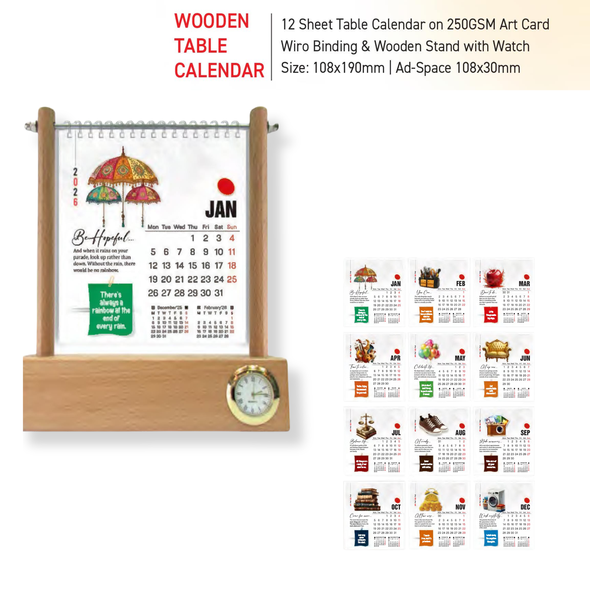 Elevate your desk with this premium table calendar crafted from 250 GSM art card, featuring a sophisticated wiro binding and sturdy wooden stand. Measuring 108x190mm, it offers the perfect balance of visibility and compact design. The 12-sheet layout provides comprehensive monthly planning, while the integrated watch adds functional elegance to your workspace. Ideal for professionals seeking a refined organizational tool that doubles as a desktop accent piece.